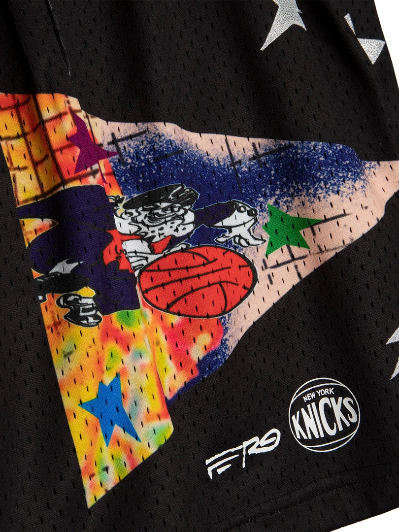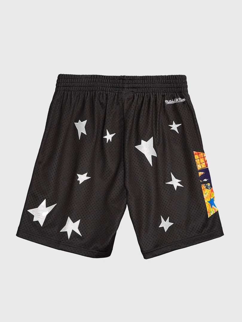 These shorts have a 100% poly mesh body, fully sublimated print, printed metallic graphics, side seam pockets, flat elasticized waistband with adjustable drawstring, embroidered and printed details and a special collaborative woven jocktag.