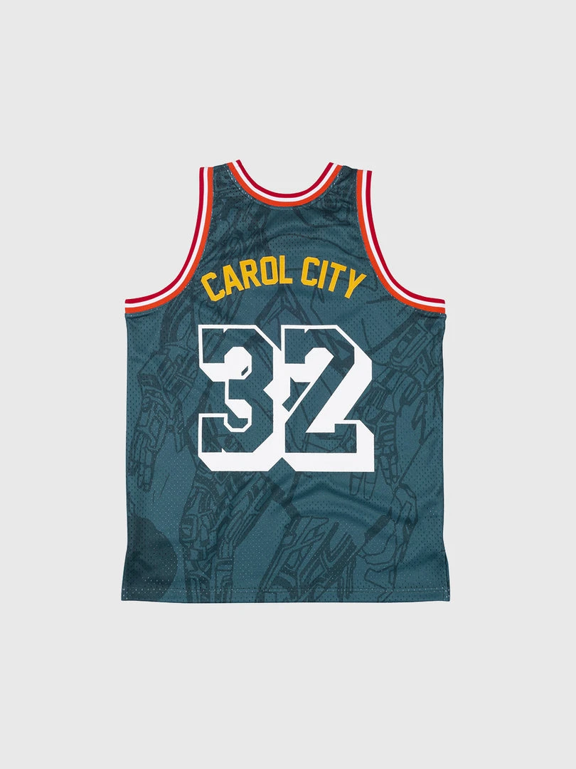 This jersey has a 100% poly mesh body, sublimated base print, heavy screen print graphics on front and back, printed tackle twill name on the back, contrast color ribbing at neck and armholes, embroidered and braiding details and a special collaborative woven jocktag.