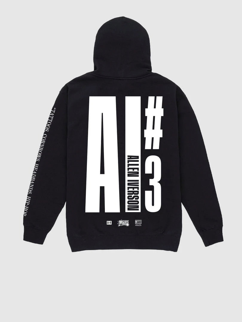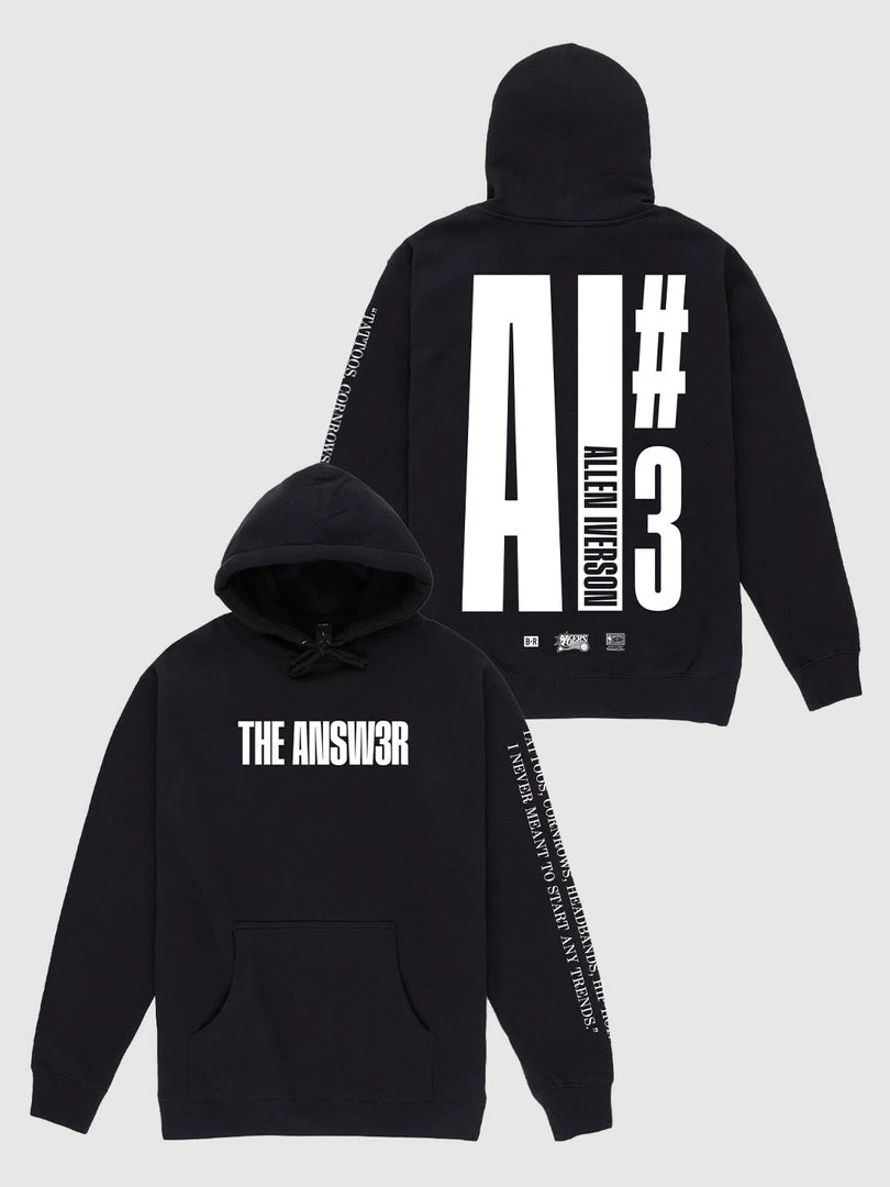 An icon on and off the court, THE ANSW3R hoodie sleeve celebrates Allen Iverson’s impact on basketball culture and beyond. Left sleeve print features the A.I. quote, “Tattoos, cornrows, headbands, hip-hop. I never meant to start any trends.”